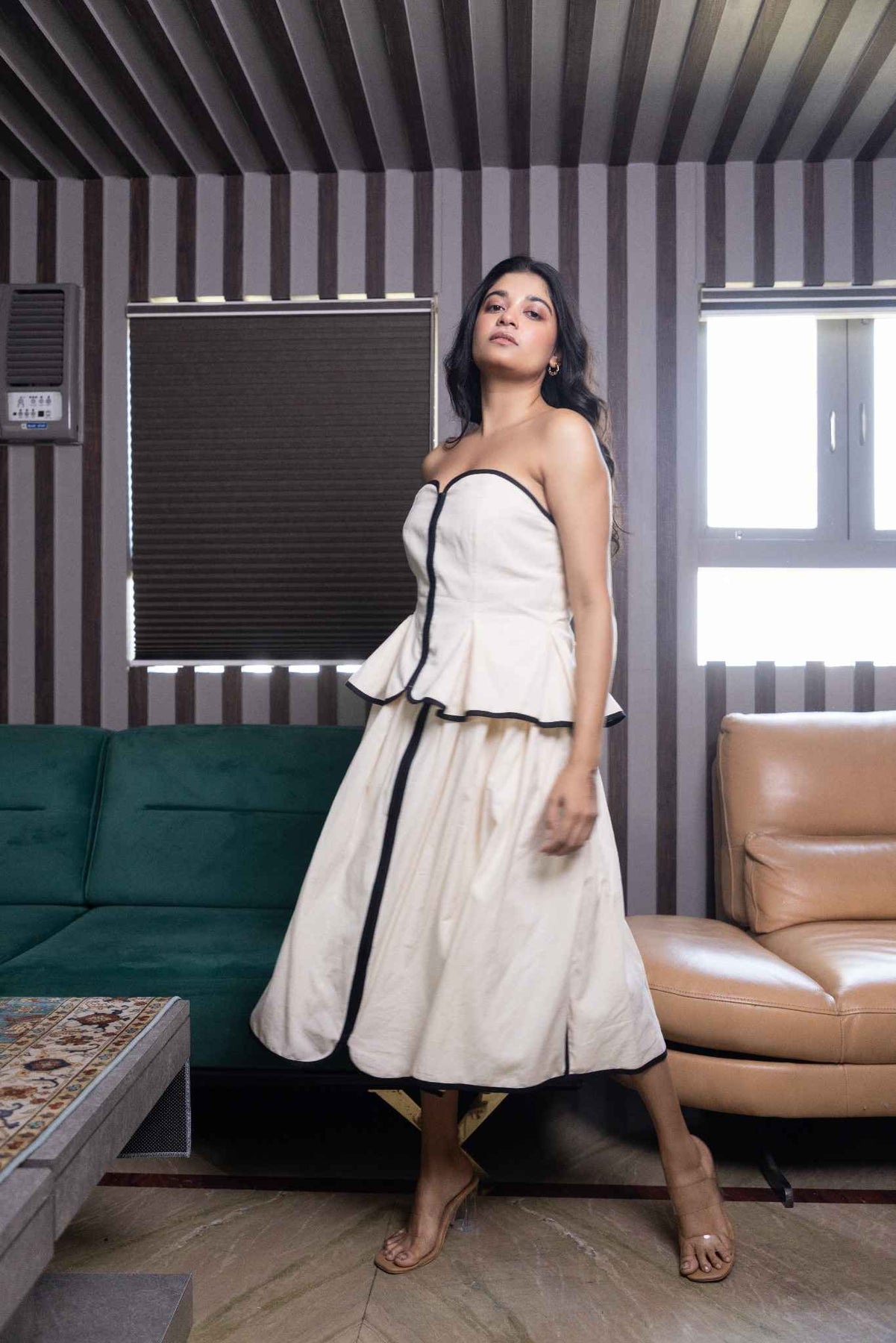 Effortlessly chic and endlessly flattering, this Ember co-ord set features a structured strapless top paired with a flowy midi skirt. The ivory fabric is beautifully accented with bold black piping, adding clean contrast and modern definition. The top’s peplum silhouette enhances the waist, while the A-line skirt creates graceful movement with every step. Perfect for brunches, celebrations, and elevated everyday dressing—this set blends contemporary style with timeless elegance.